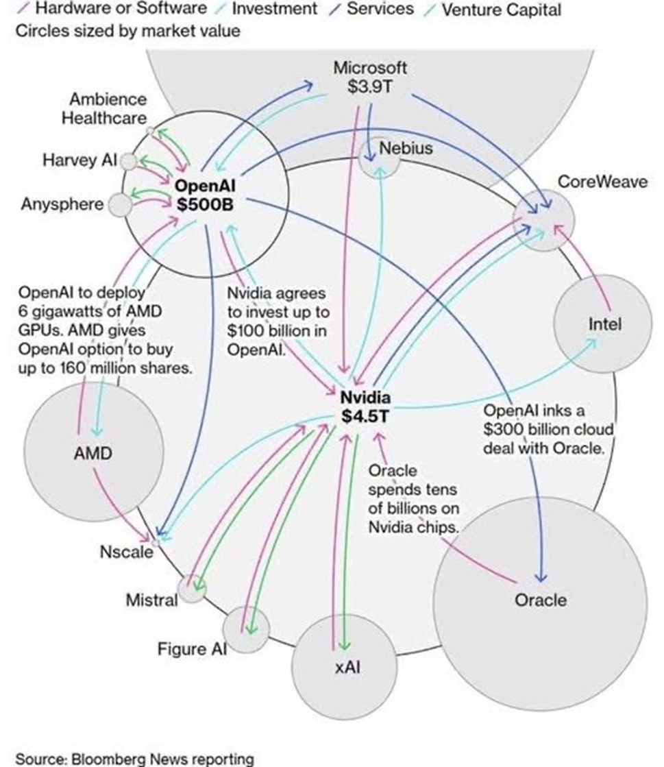 Questo è l’ecosistema delle società che ruotano intorno all’AI, e che solleva qualche più di una preoccupazione qualora una società come NVDIA fosse colpita da nuove restrizioni all’export di chip, o qualora la Cina invadesse Taiwan, compromettendo la capacità produttiva di TSMC (che anche per questa ragione, è stata tra le prima ad accogliere l’invito della presidenza Trump a produrre negli Stati Unti).